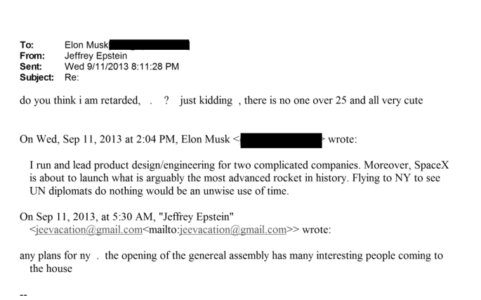 At one point in the correspondence Epstein references Musk’s then wife Talulah Riley citing concerns about “the ratio on my island might make Talilah uncomfortable.” Musk calmy assuaged Jeff’s fears and replied “Ratio is not a problem for Talulah.” One must wonder how many underage girls Musk and his ex-wife ravaged on that awful island, perhaps with Bill Clinton.